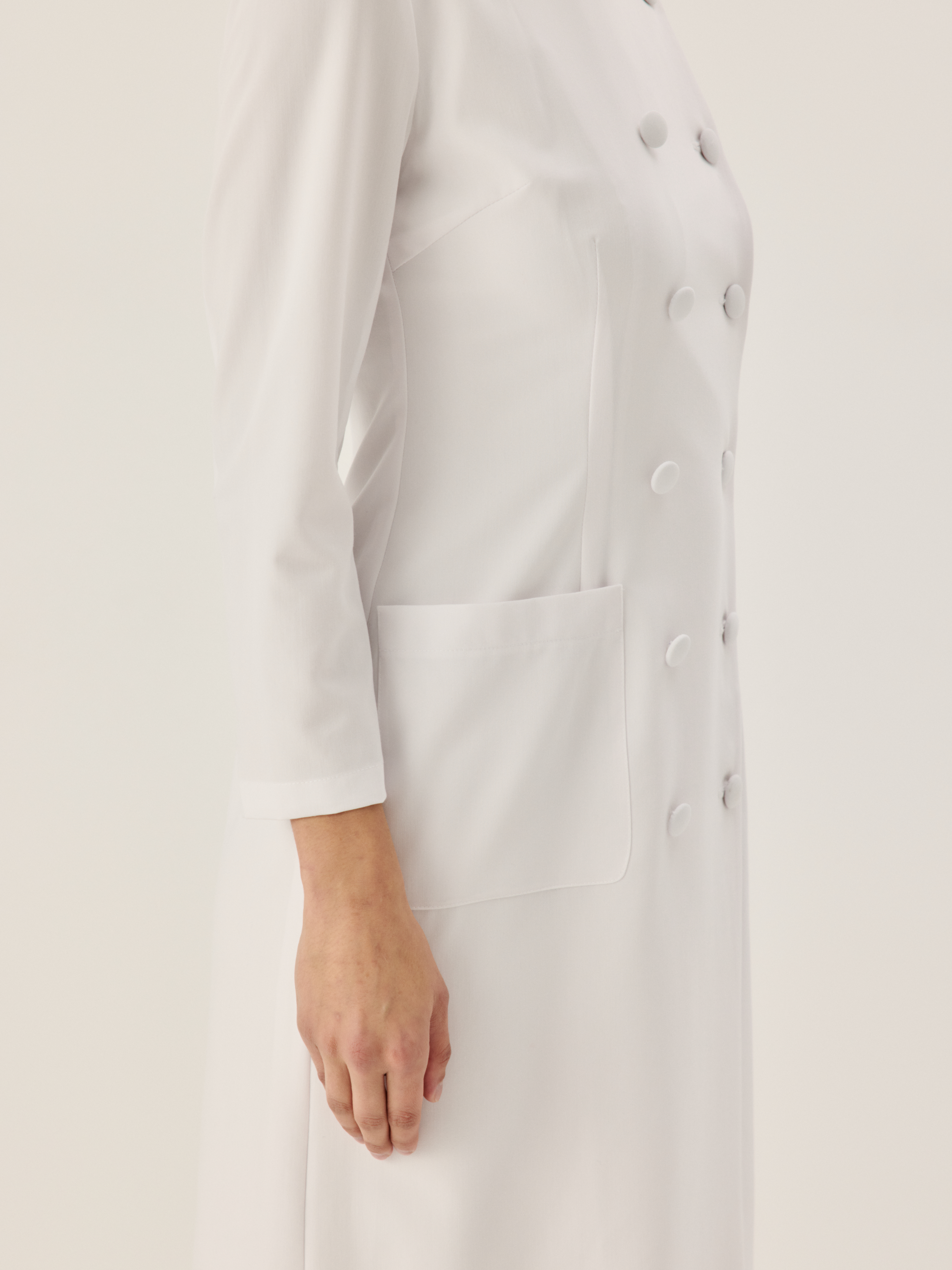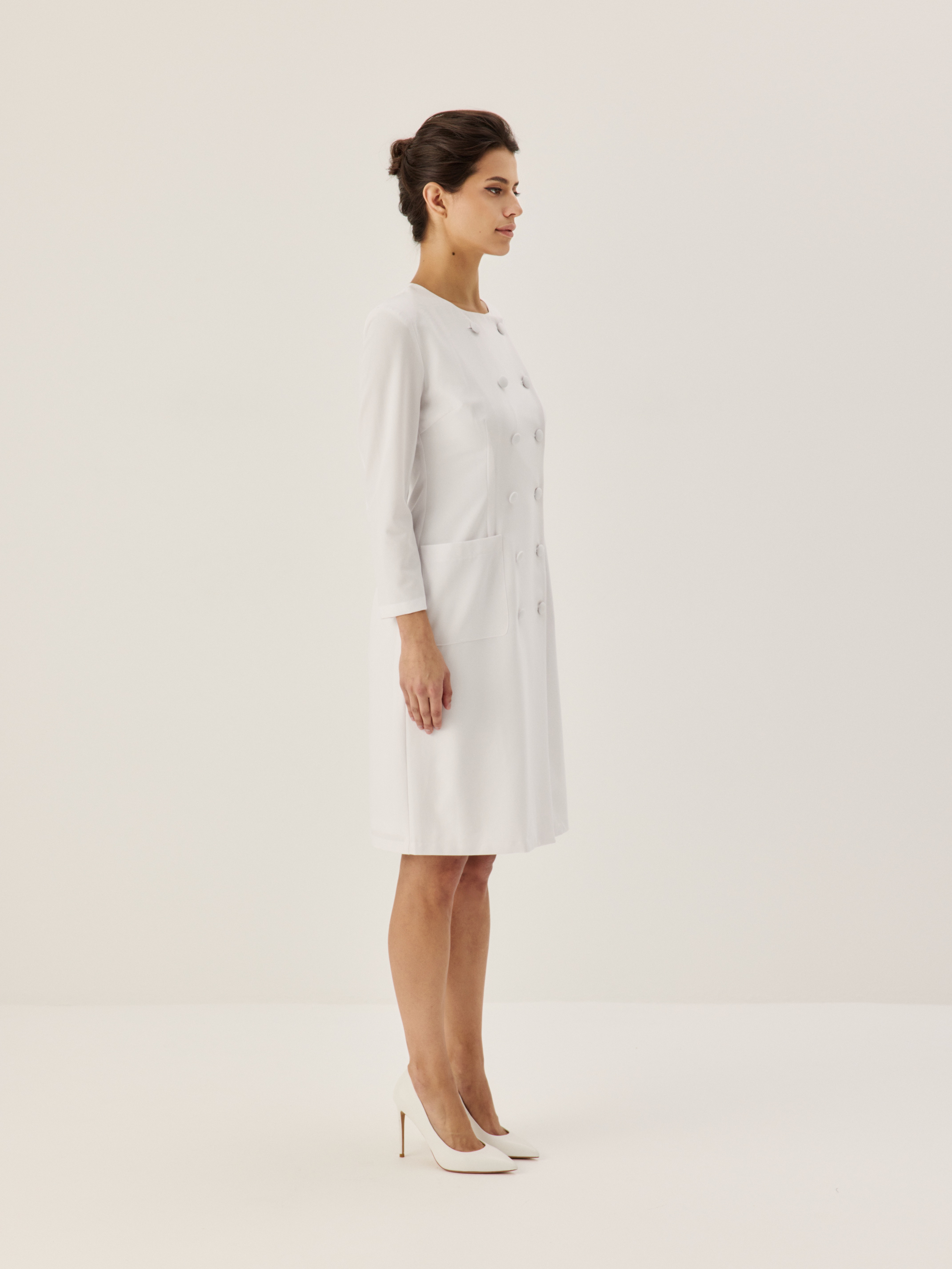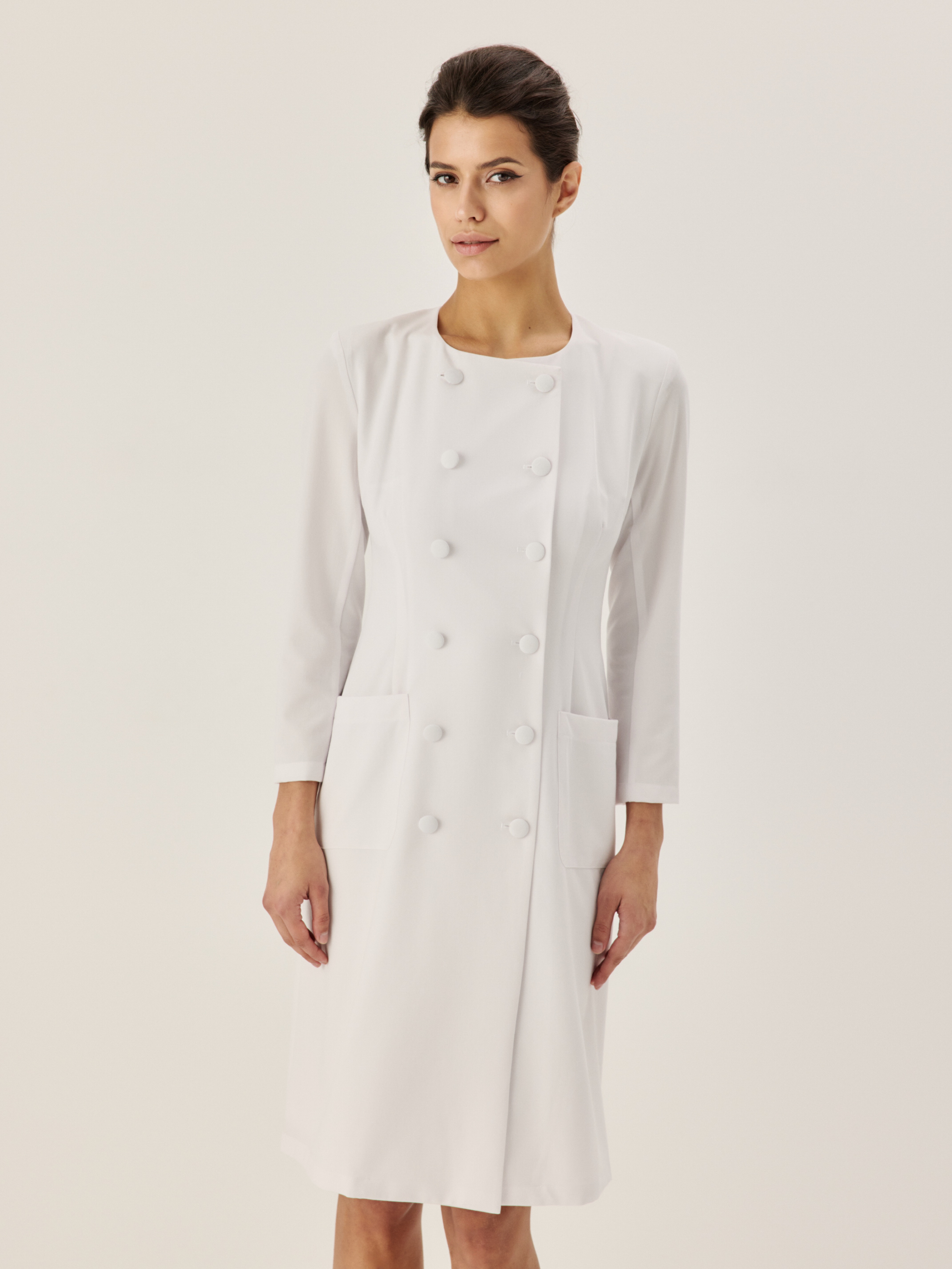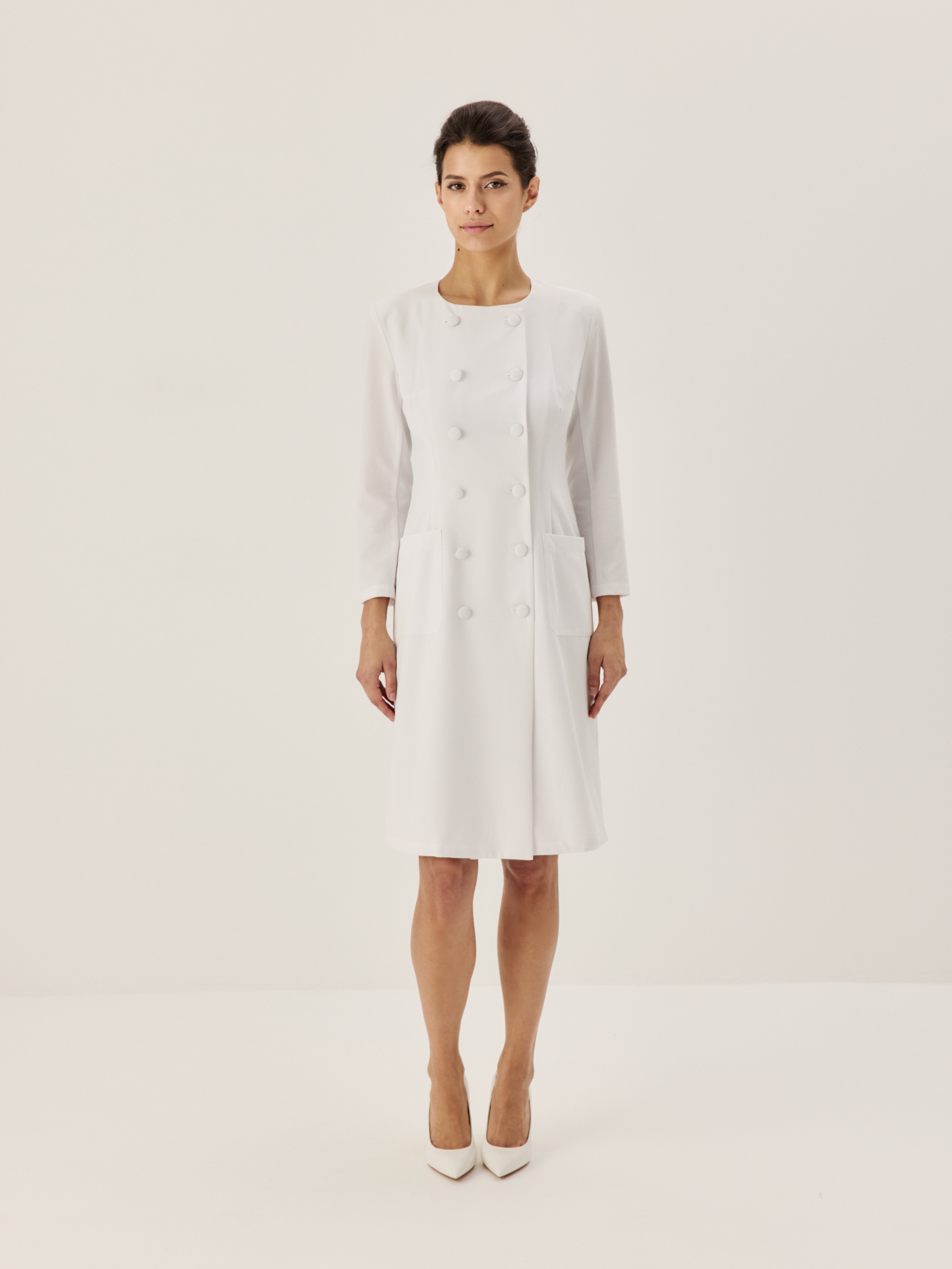 Модель "Габриель" — стильное воплощение современной профессиональной одежды, вдохновленное грацией и утонченностью Светланы Захаровой и её исполнением в балете "Габриель". Это элегантное белое двубортное платье характеризуется минималистичным дизайном с чистыми линиями и аккуратными пуговицами, создающими сдержанный, гармоничный образ. Рукава длиной три четверти добавляют образу изысканности и практичности, а прямой крой подчёркивает современный и утончённый стиль. Идеальный выбор для деловой среды, модель "Габриель" сочетает в себе стиль и комфорт, демонстрируя актуальную интерпретацию безвременной моды.