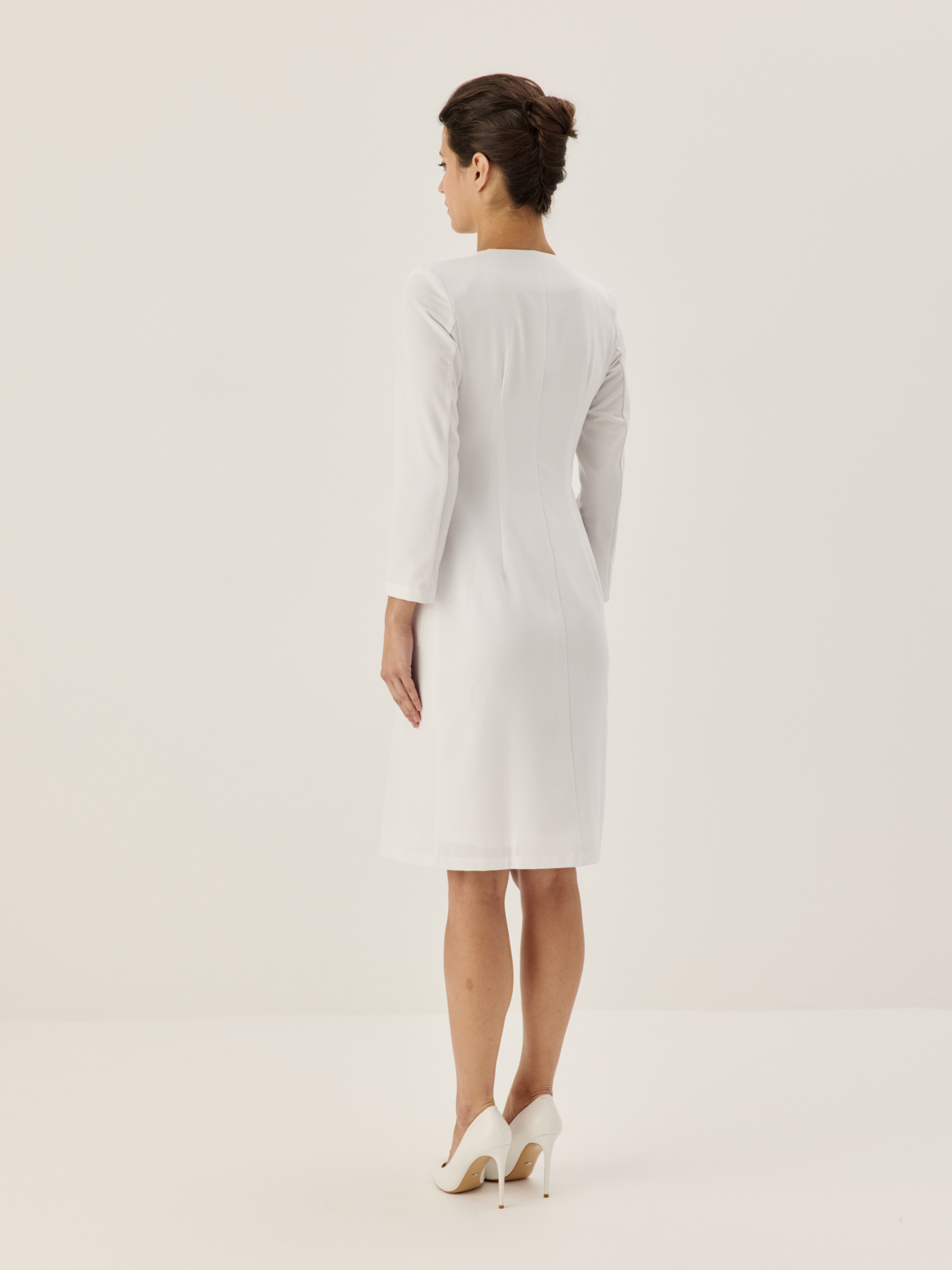 Модель "Габриель" — стильное воплощение современной профессиональной одежды, вдохновленное грацией и утонченностью Светланы Захаровой и её исполнением в балете "Габриель". Это элегантное белое двубортное платье характеризуется минималистичным дизайном с чистыми линиями и аккуратными пуговицами, создающими сдержанный, гармоничный образ. Рукава длиной три четверти добавляют образу изысканности и практичности, а прямой крой подчёркивает современный и утончённый стиль. Идеальный выбор для деловой среды, модель "Габриель" сочетает в себе стиль и комфорт, демонстрируя актуальную интерпретацию безвременной моды.
