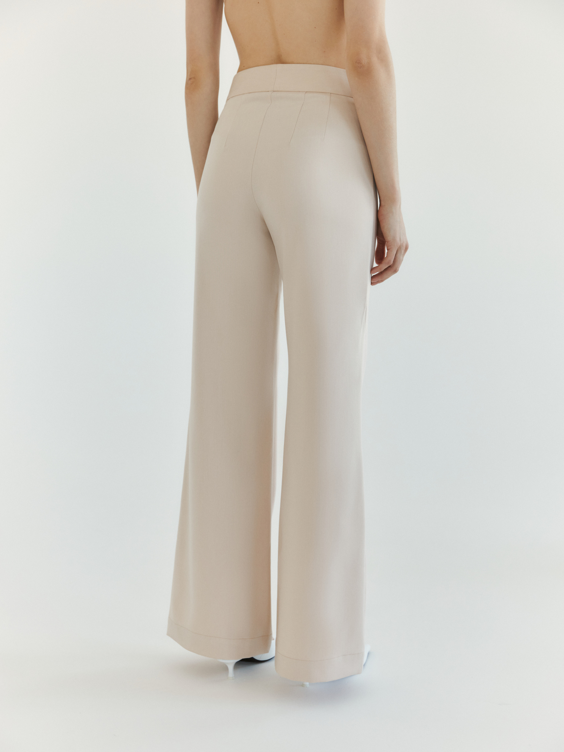 Свободные брюки-клеш с посадкой на талии. Застегиваются на жемчужную пуговицу.Уточняйте наличие моделей вашего размера у менеджеров по телефону +7 985 744-59-99.
