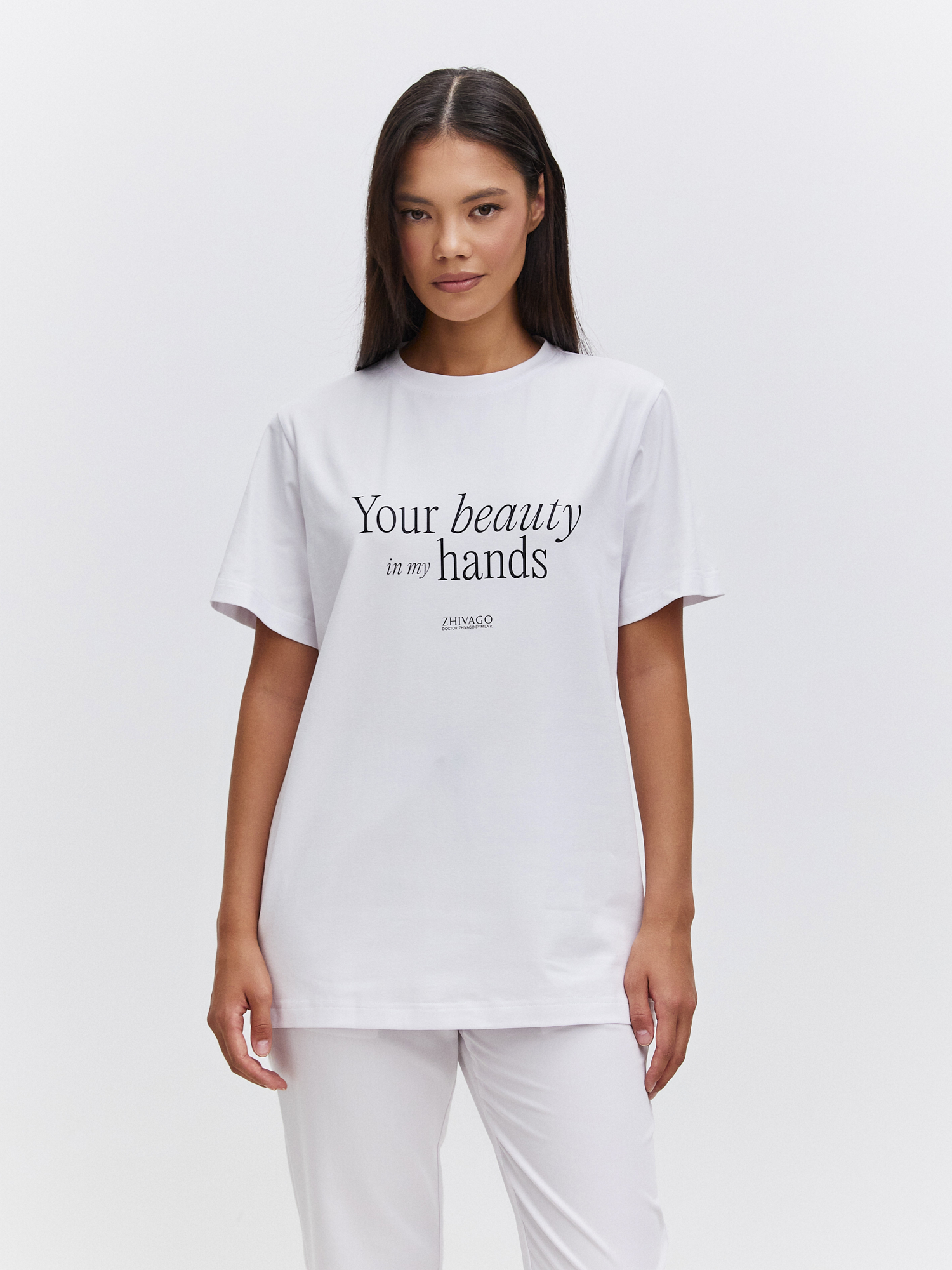 Футболка «Your beauty in my hands» Коллекция, созданная в рамках акции Doctor Zhivago by Mila P. совместно с благотворительным фондом «ГЕРОИ» , c вдохновляющими слоганами посвящена докторам – послание уважения и поддержки всем медицинским сотрудникам от пациентов. В основе акции — идея сказать слова благодарности тем, кто каждый день помогает нам сохранить здоровье.