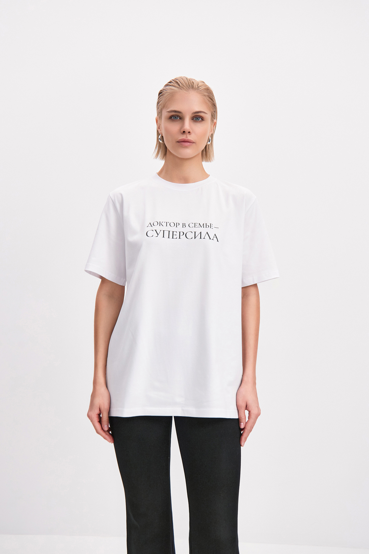 Футболка «Доктор в семье – суперсила» Коллекция, созданная в рамках акции Doctor Zhivago by Mila P. совместно с благотворительным фондом «ГЕРОИ» , c вдохновляющими слоганами посвящена докторам – послание уважения и поддержки всем медицинским сотрудникам от пациентов. В основе акции — идея сказать слова благодарности тем, кто каждый день помогает нам сохранить здоровье.