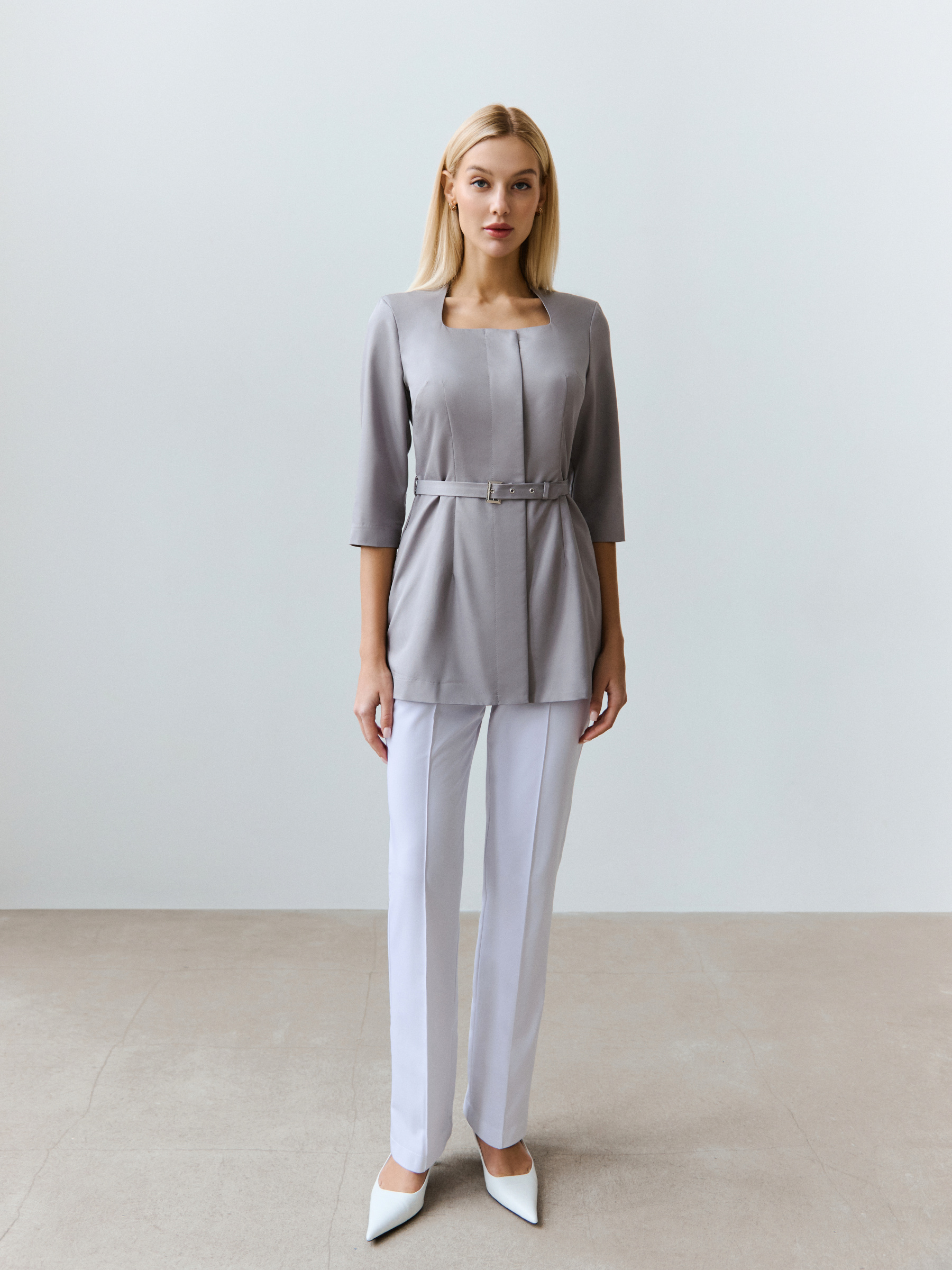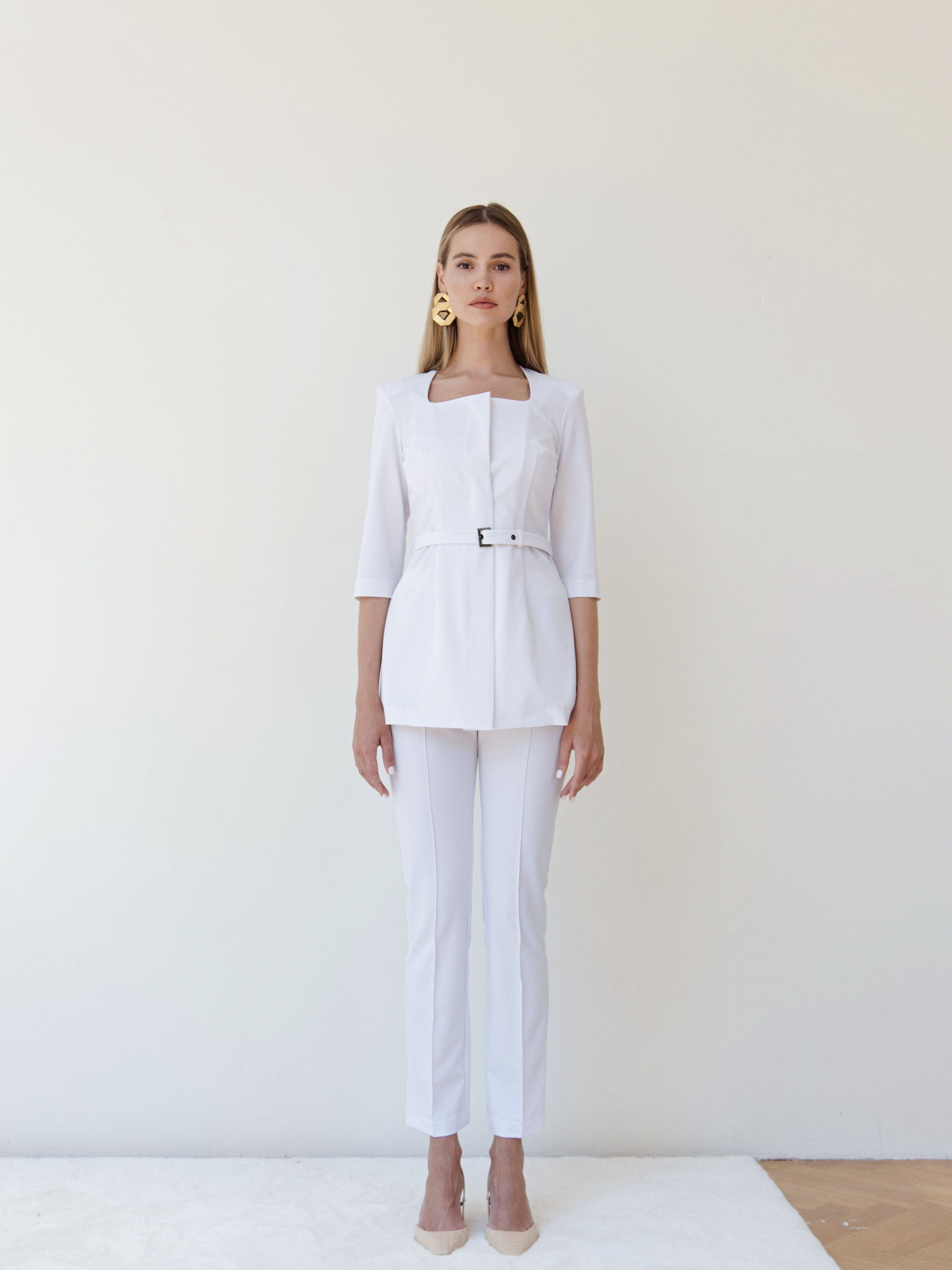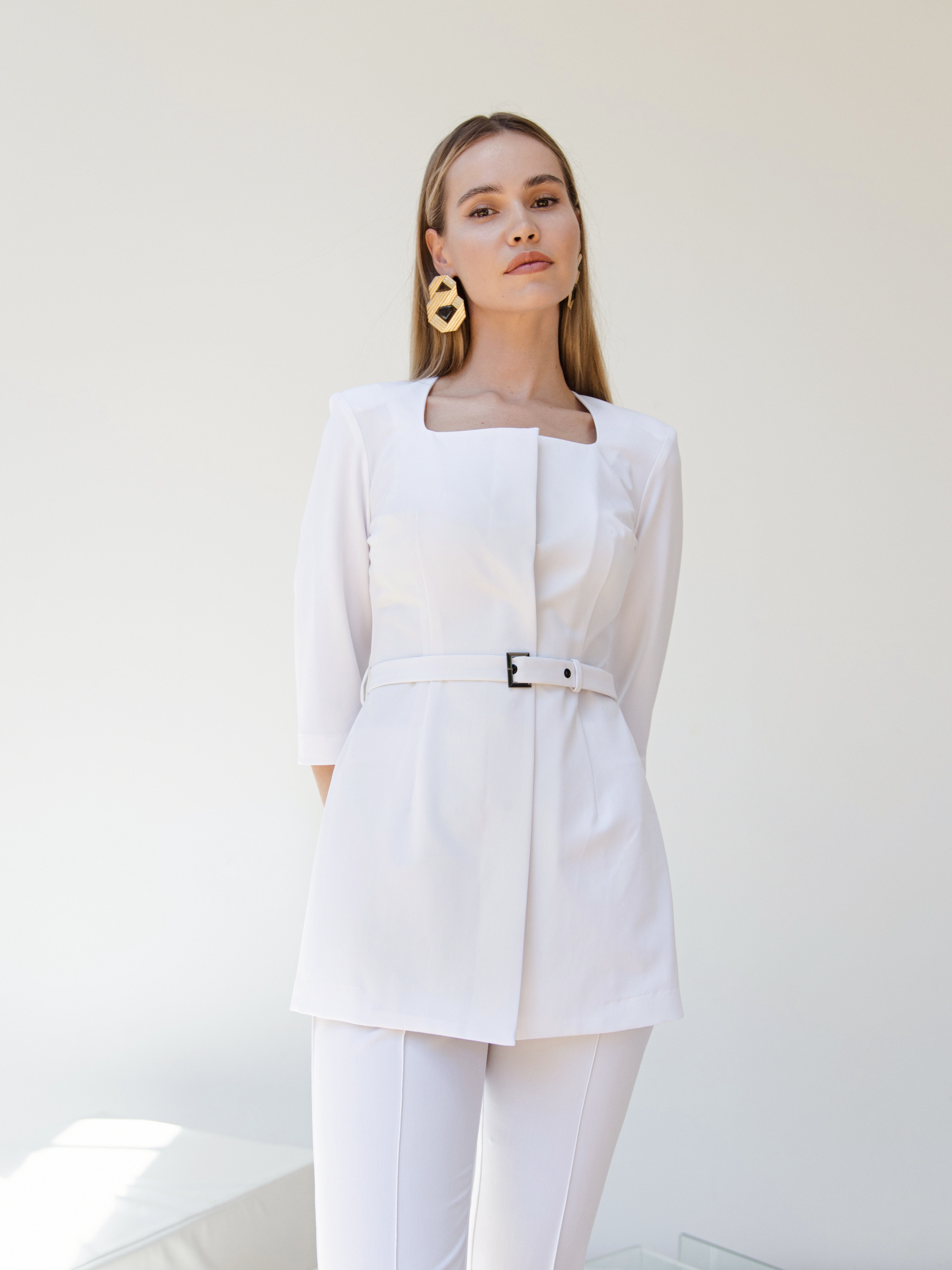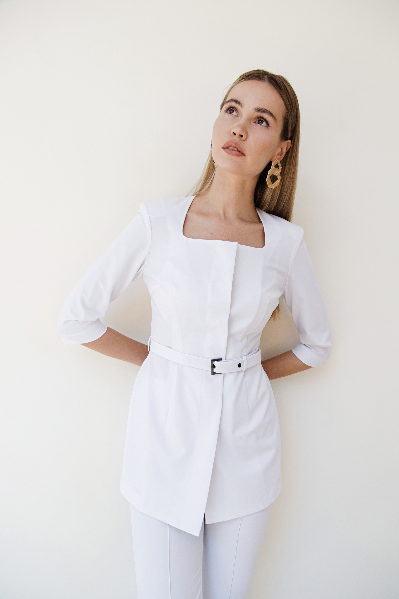 Блейзер с оригинальным U-образным вырезом с рукавами 3/4 и боковыми карманами. Модель застёгивается на кнопки и украшена поясом. Нанесение Вашего логотипа или имени на наши модели придает особенный стиль и элегантность. Оставьте комментарий при оформлении заказа и наш менеджер рассчитает стоимость нанесения имени или логотипа. Уточняйте наличие моделей вашего размера у менеджеров по телефону +7 985 744-59-99.