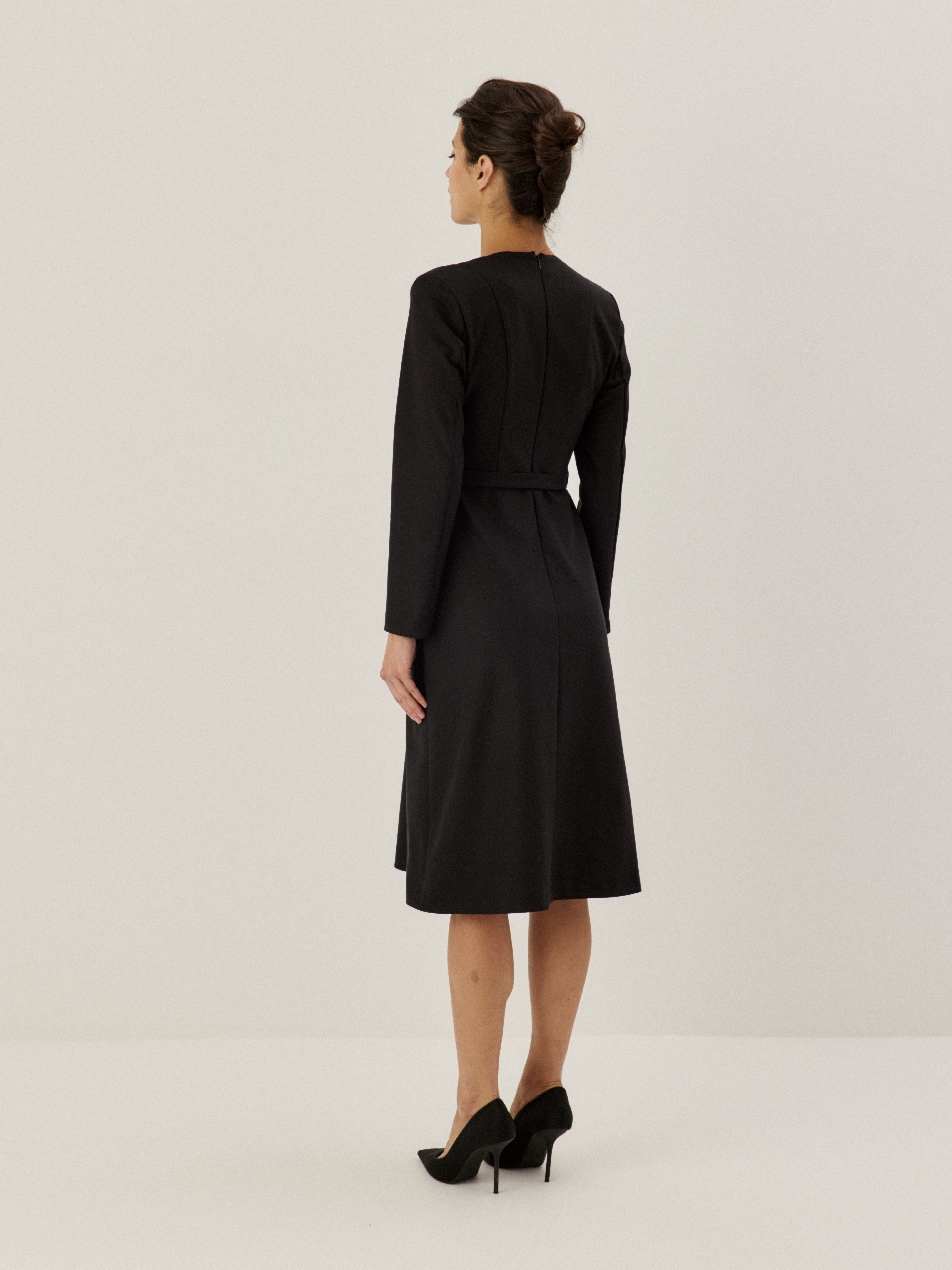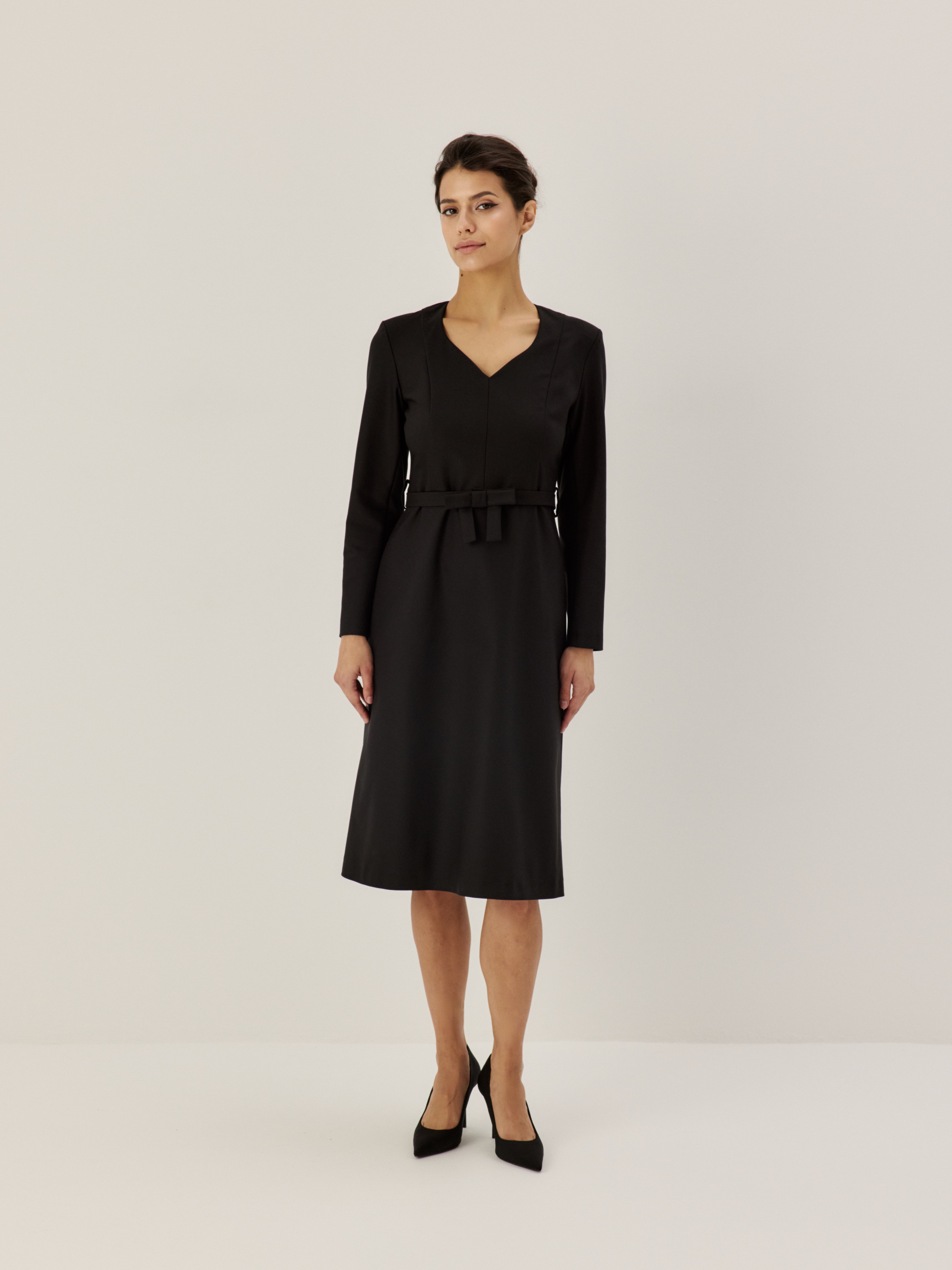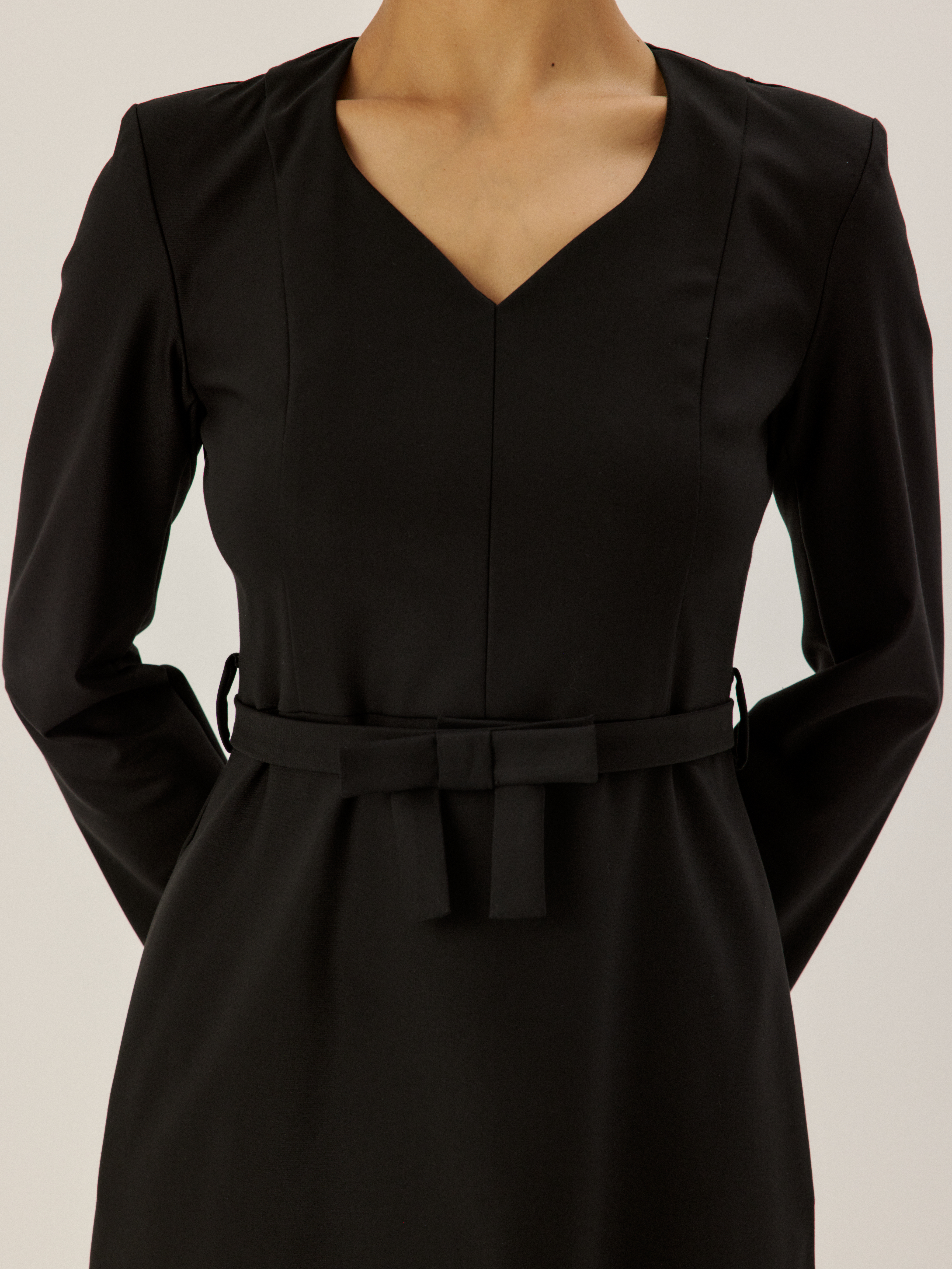 Платье создано в честь дивы Марии Каллас — величайшей оперной певицы. Приталенный силуэт с фигурным вырезом подчёркивает изящные линии шеи. Модель дополнена удобными внутренними боковыми карманами. Талию обрамляет тонкий пояс с элегантным бантом. Рукава три четверти открывают запястья, придавая образу возвышенность и аристократичность.