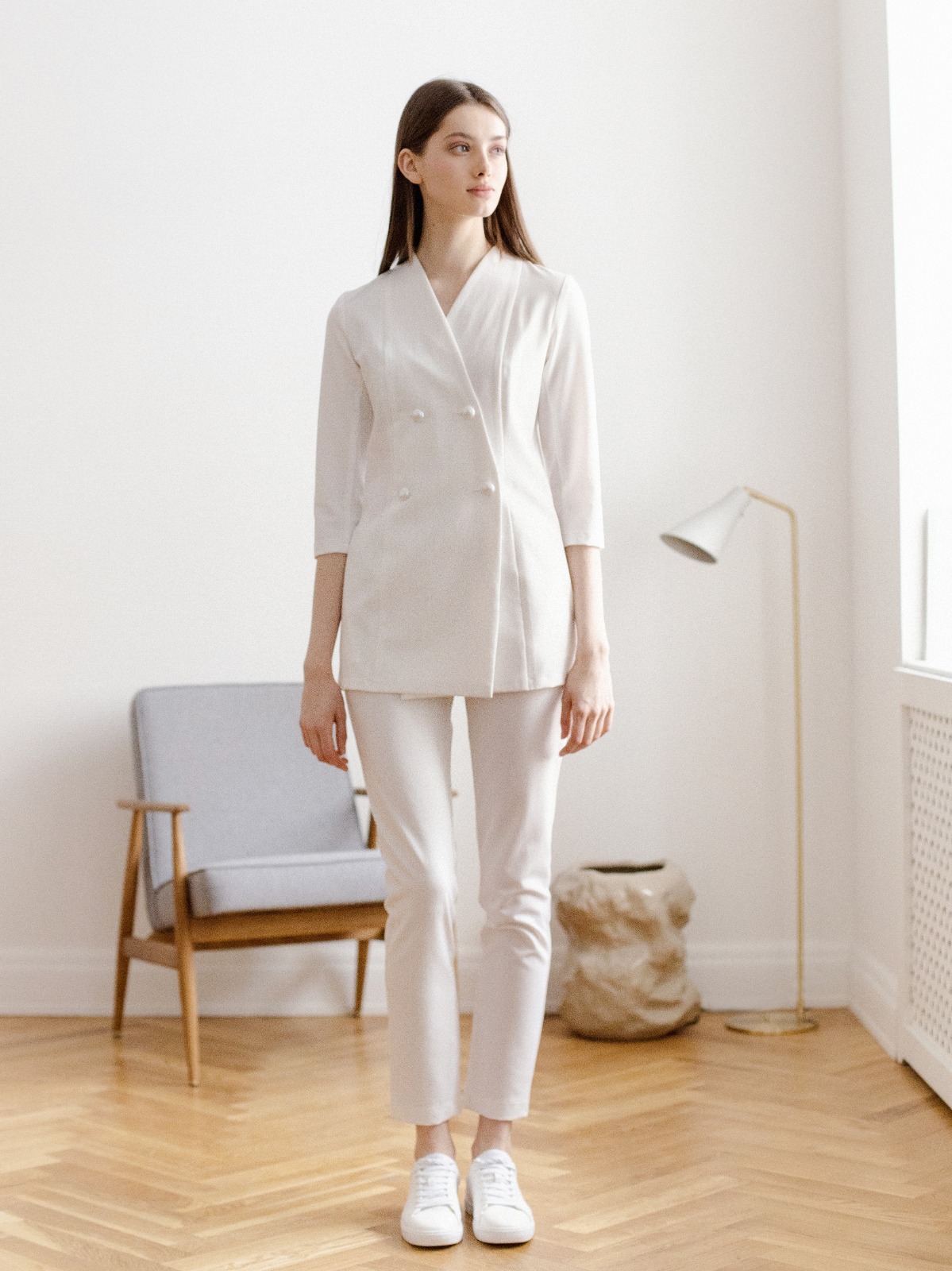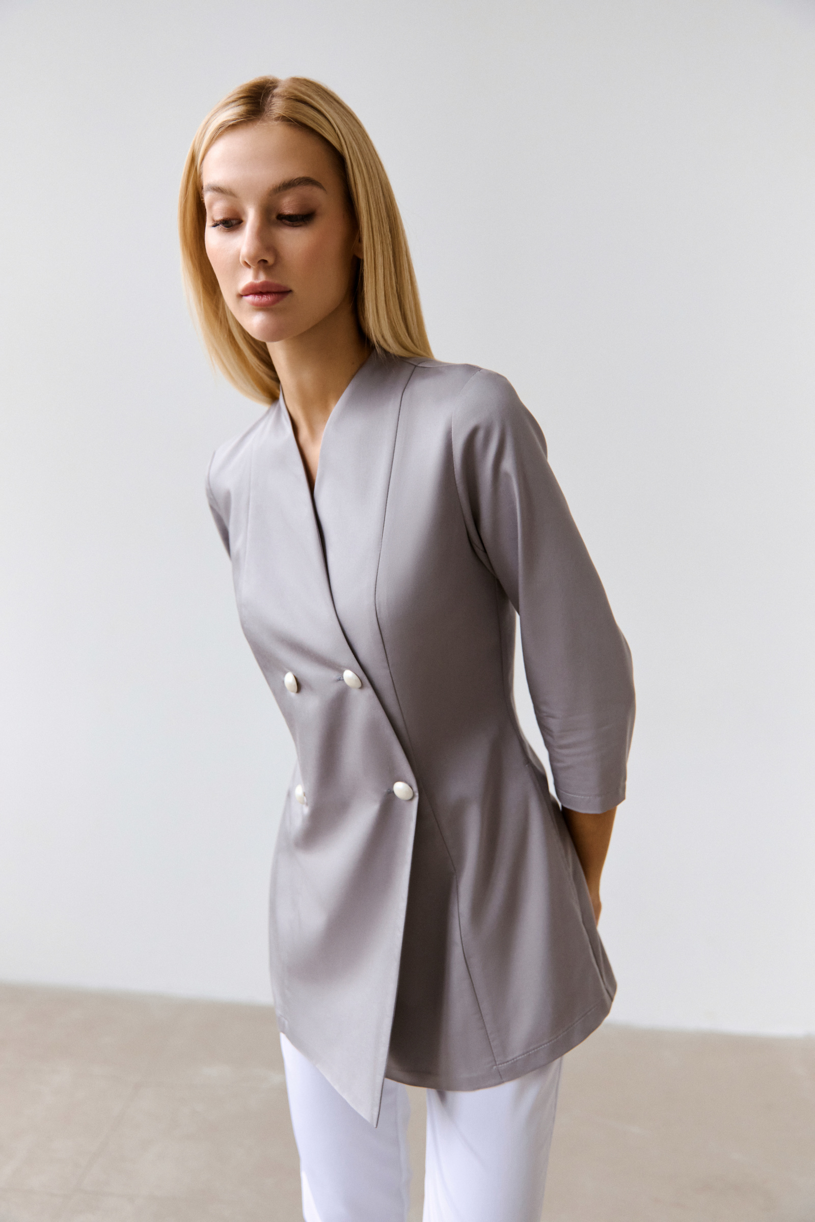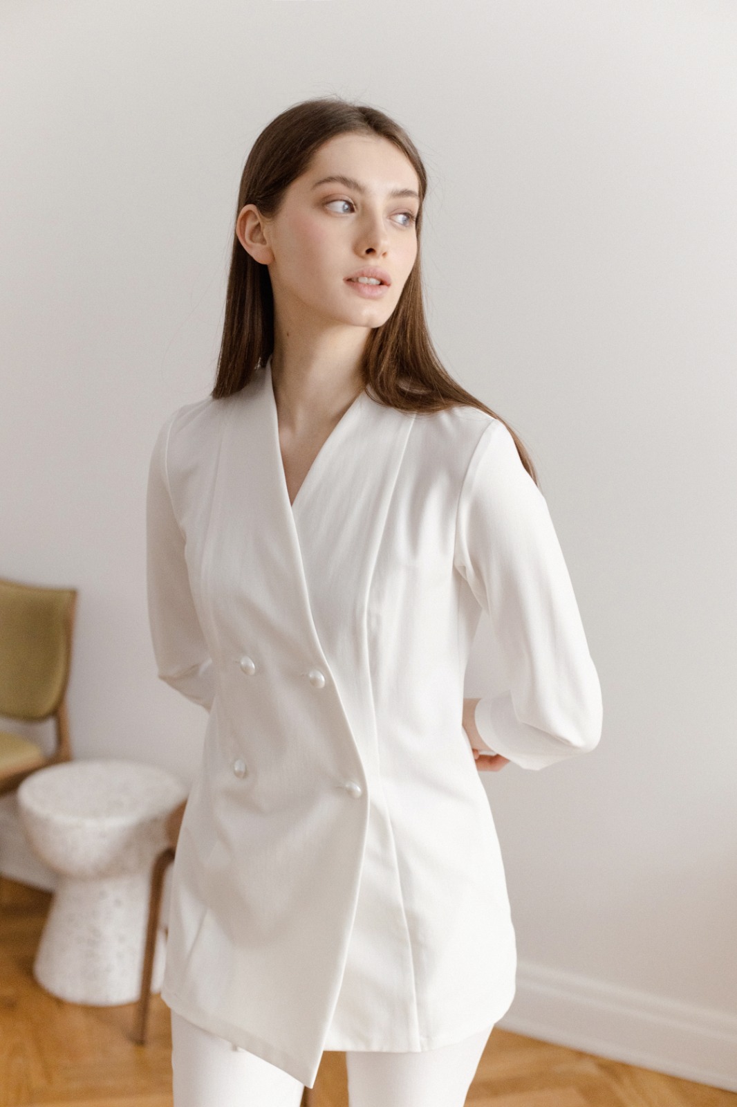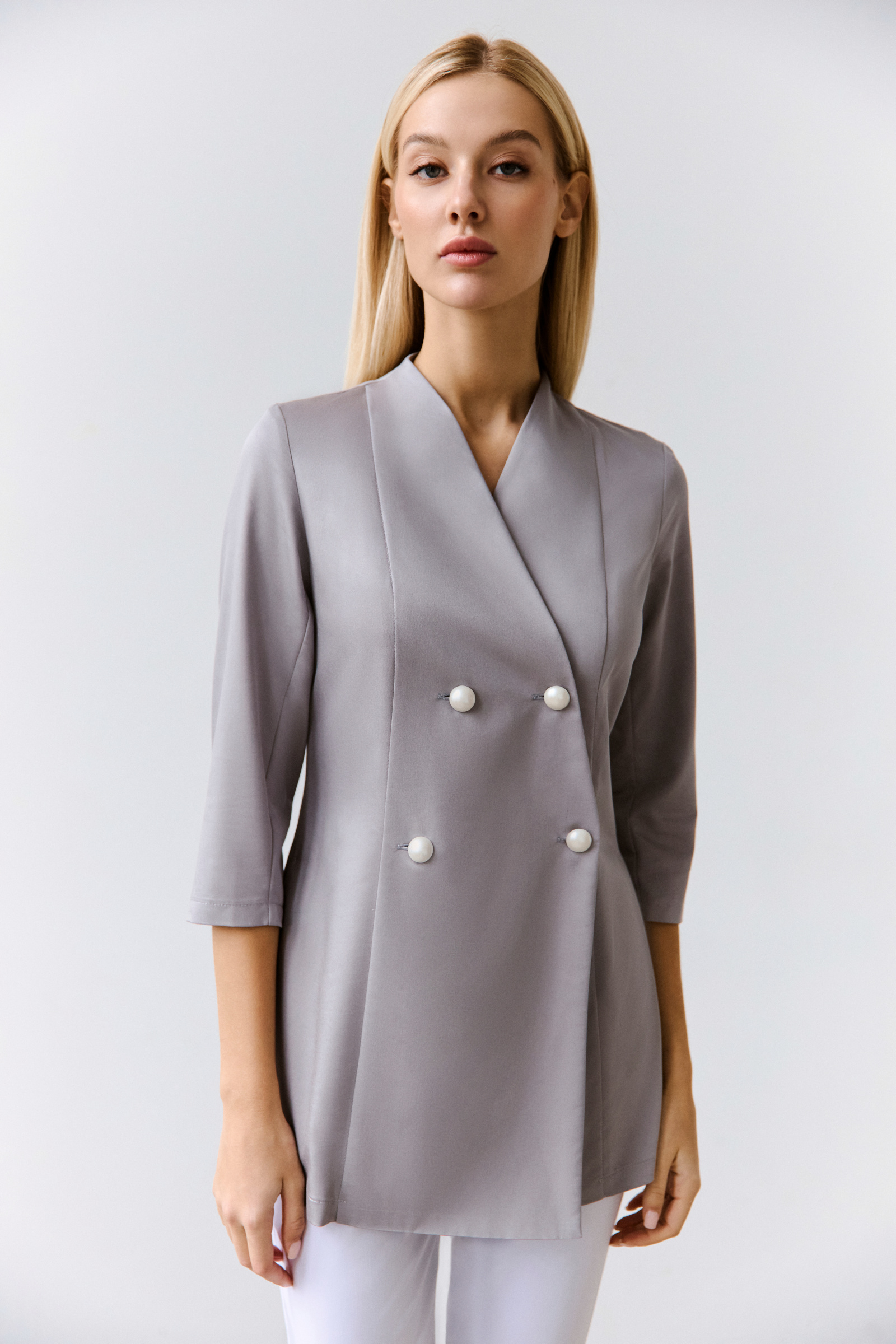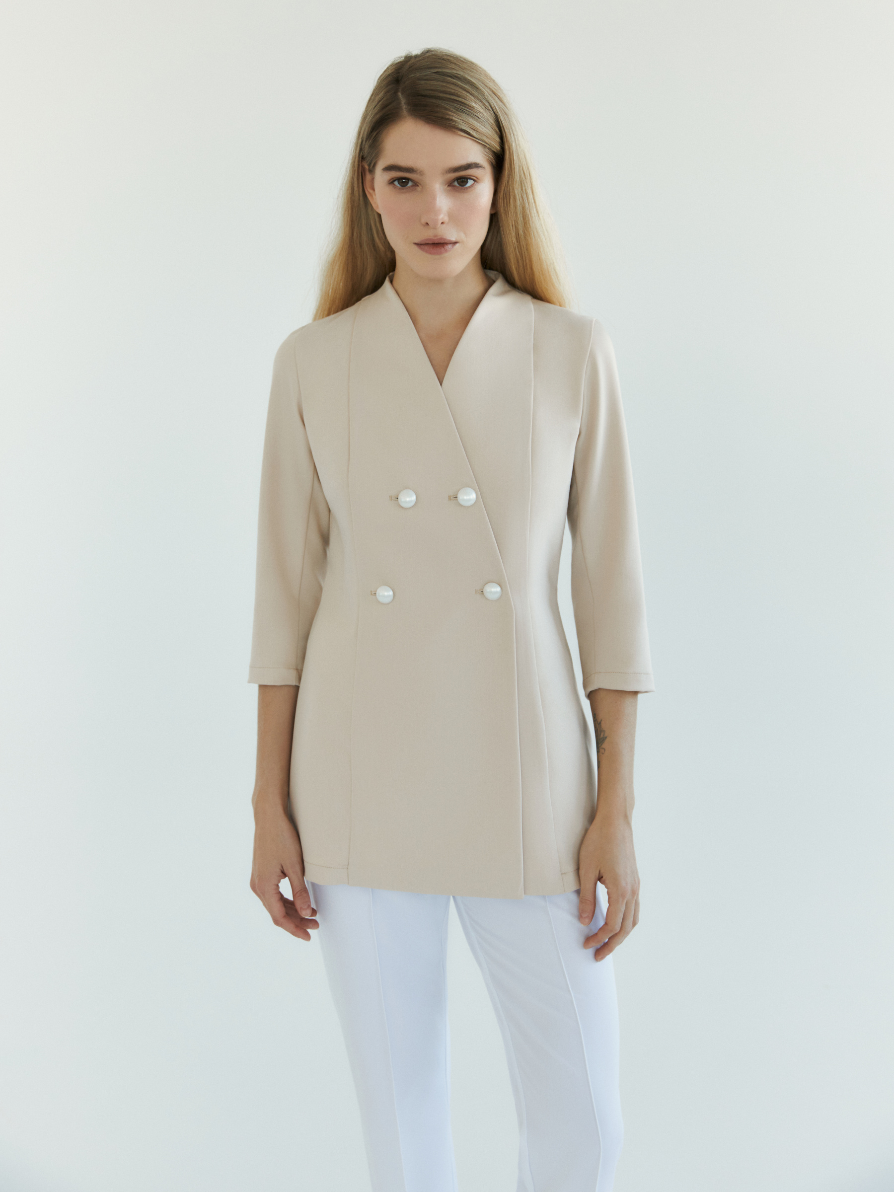 Двубортный жакет декорированнй жемчужными пуговицами и вместительными карманами по бокам. Нанесение Вашего логотипа или имени на наши модели придает особенный стиль и элегантность. Оставьте комментарий при оформлении заказа и наш менеджер рассчитает стоимость нанесения имени или логотипа. Уточняйте наличие моделей вашего размера у менеджеров по телефону +7 985 744-59-99.